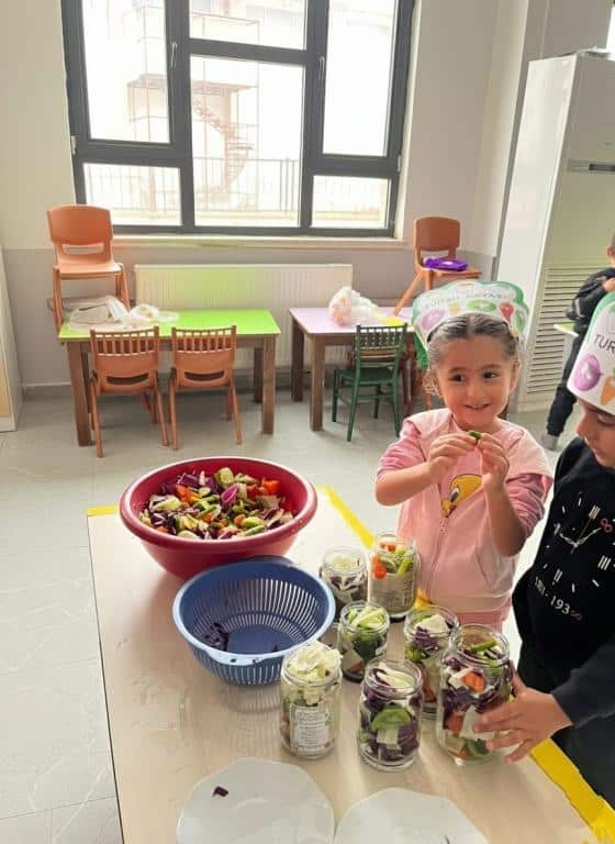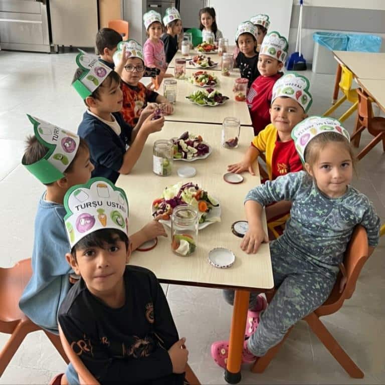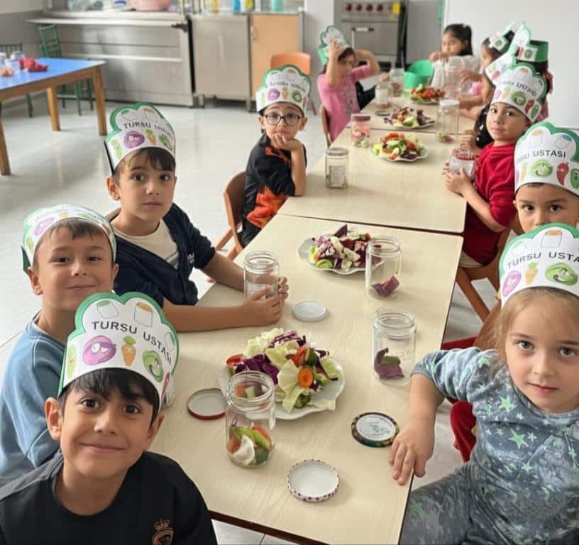Kendi elleriyle hazırladıkları aşçı şapkalarını takan minik şefler, heyecanla masanın etrafına toplandı. Sadece bir yiyecek hazırlama faaliyeti olmaktan öte, bu etkinlik öğrencilere duyusal bir keşif sundu. Onlar için turşu, salatalıkların çıtır çıtır sesinden, sarımsağın keskin kokusuna ve sebzelerin taze aromasına kadar pek çok duyuyu harekete geçiren bir serüvene dönüştü. Öğretmenlerinin rehberliğinde malzemeleri tanıyarak ve aşamaları takip ederek bilişsel becerilerini de geliştirdiler.